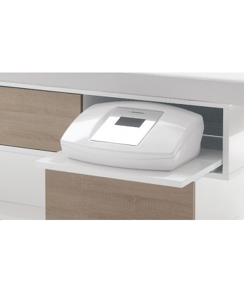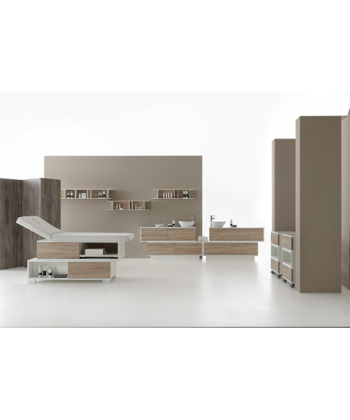 Функциональная и эргономичная модель, позволяющая рационально использовать пространство. Она оснащена двумя выдвигающимися ящиками и двумя открытыми полками для хранения инструментов и различных средств. Каркас кушетки изготовлен из меламина, ящики – из древесины. Возможно изготовление ящиков в трех вариантах – натуральный венге, белая лиственница, дуб бардолино. Обивка матраса выполнена из искусственной кожи, присутствует отверстие для лица и держатель для рулонных полотенец. Предусмотрена регулировка угла наклона спинки. Модель отличается износоустойчивостью и комфортом как для клиента, так и мастера.